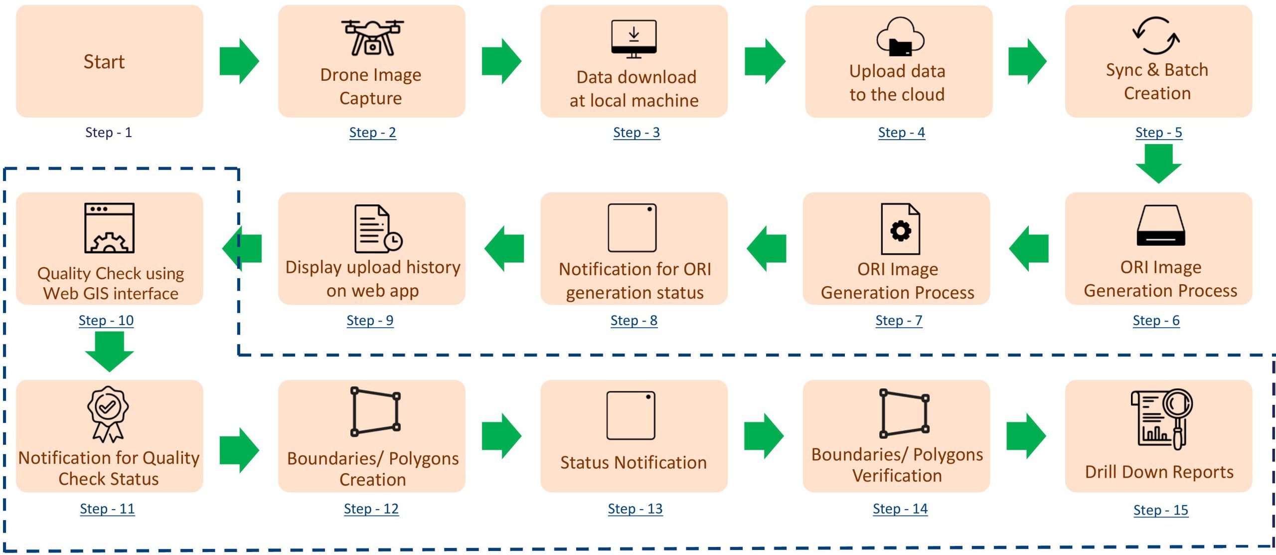 Dashboard for Process Status To provide a holistic view of the land surveying process, GIS incorporates various dashboards. These dashboards display the status and progress of different stages, including image synchronization, orthomosaic generation, boundary creation, and report generation. Real-time updates on the dashboard help project managers and stakeholders track the project’s overall progress effectively.
